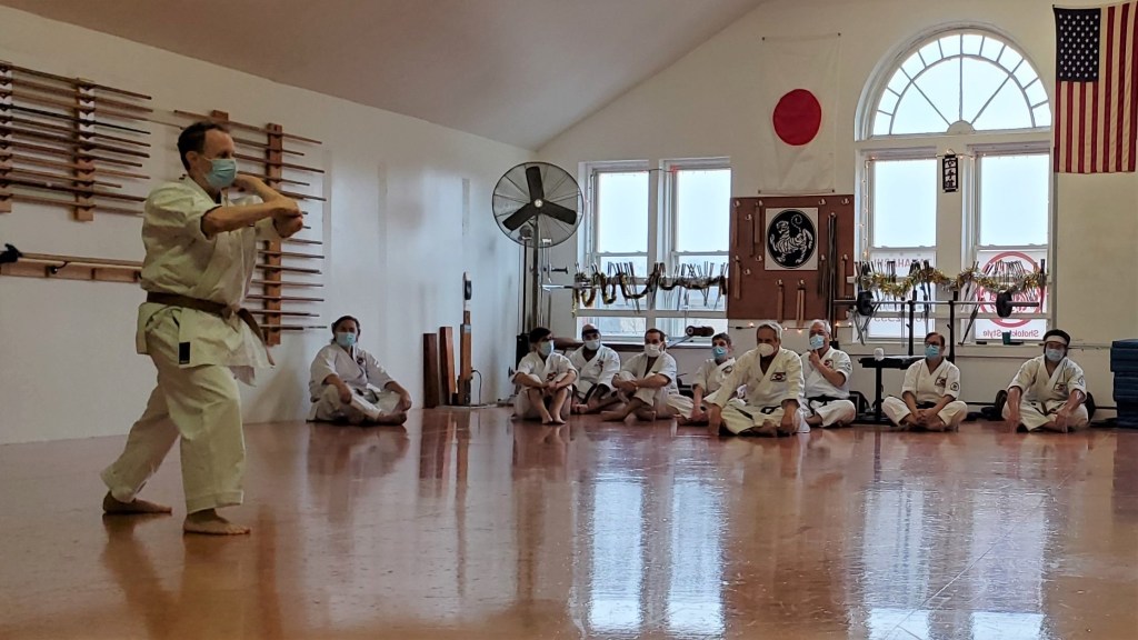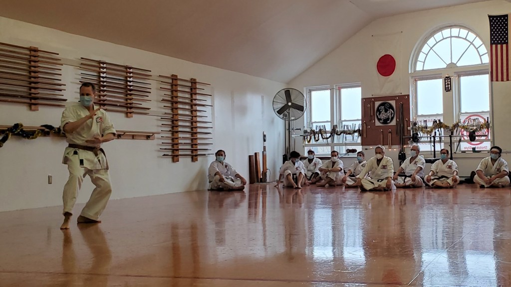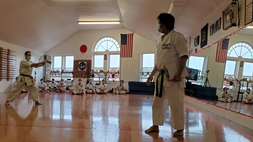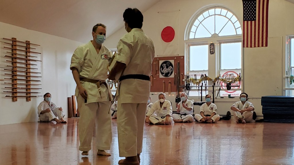 Chris Winfrey performing the kata Chinte for his 1st Degree Black BeltChris Winfrey performing the kata Bassai Sho for his 1st Degree Black BeltChris Winfrey performing Heian Godan as his favorite kata for his 1st Degree Black BeltChris Winfrey performing the Bo kata Rinbu No Kon for his 1st Degree Black BeltSensei Takahashi providing feedback on the kata ChinteSensei Takahashi awarding Chris Winfrey his 1st Degree Black Belt