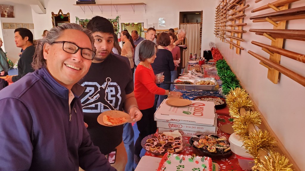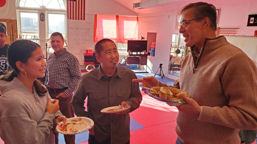 Each year the Mt. Kisco Dojo celebrates the beginning of the Holiday Season by getting together, and enjoying wonderful food, good conversation, and strong Dojo spirit. As in past years, the Dojo was decorated with colorful lights & garlands, along with Holiday music playing in the background.