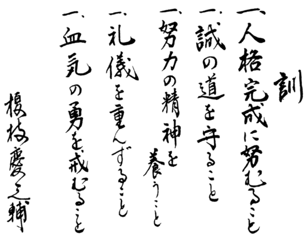 Dojo Kun (Five Guiding Principles) Seek Perfection of Character Be Faithful Endeavor to Excel Respect Others Refrain From Violent Behavior Share this: Share on Facebook (Opens in new window) Facebook Like Loading...